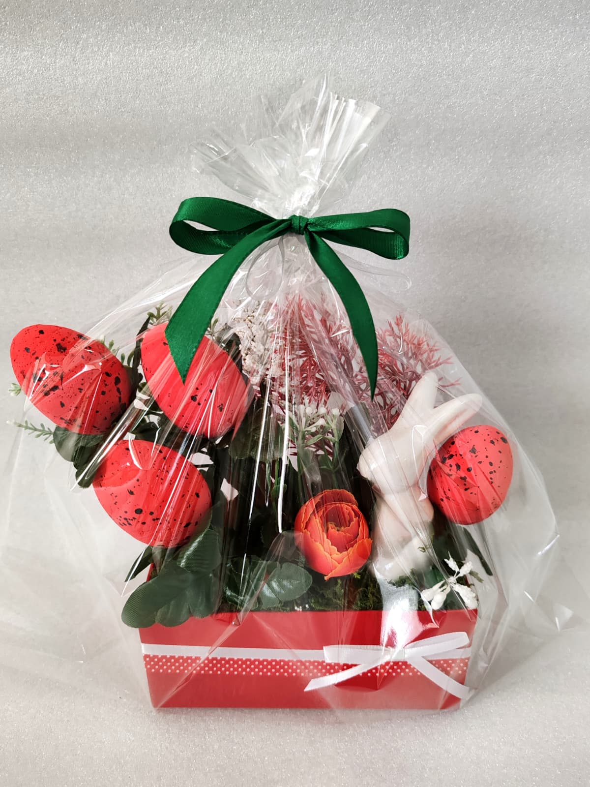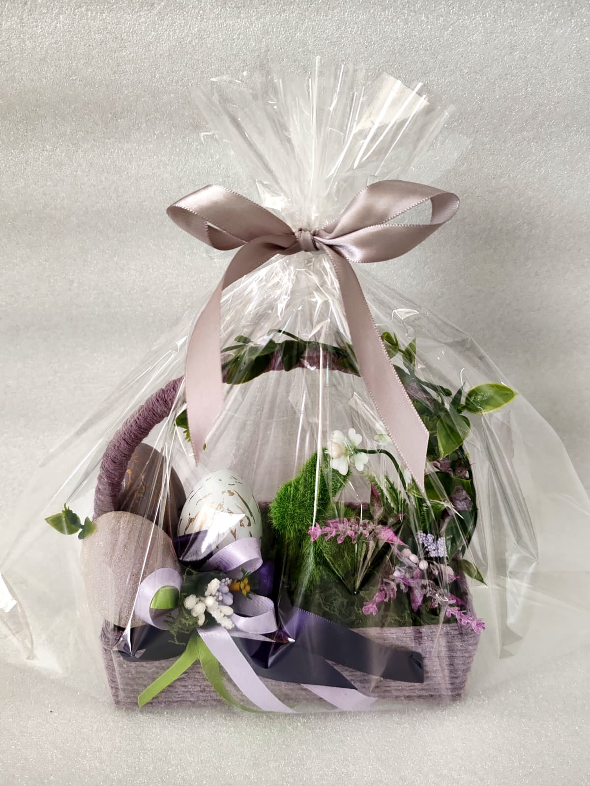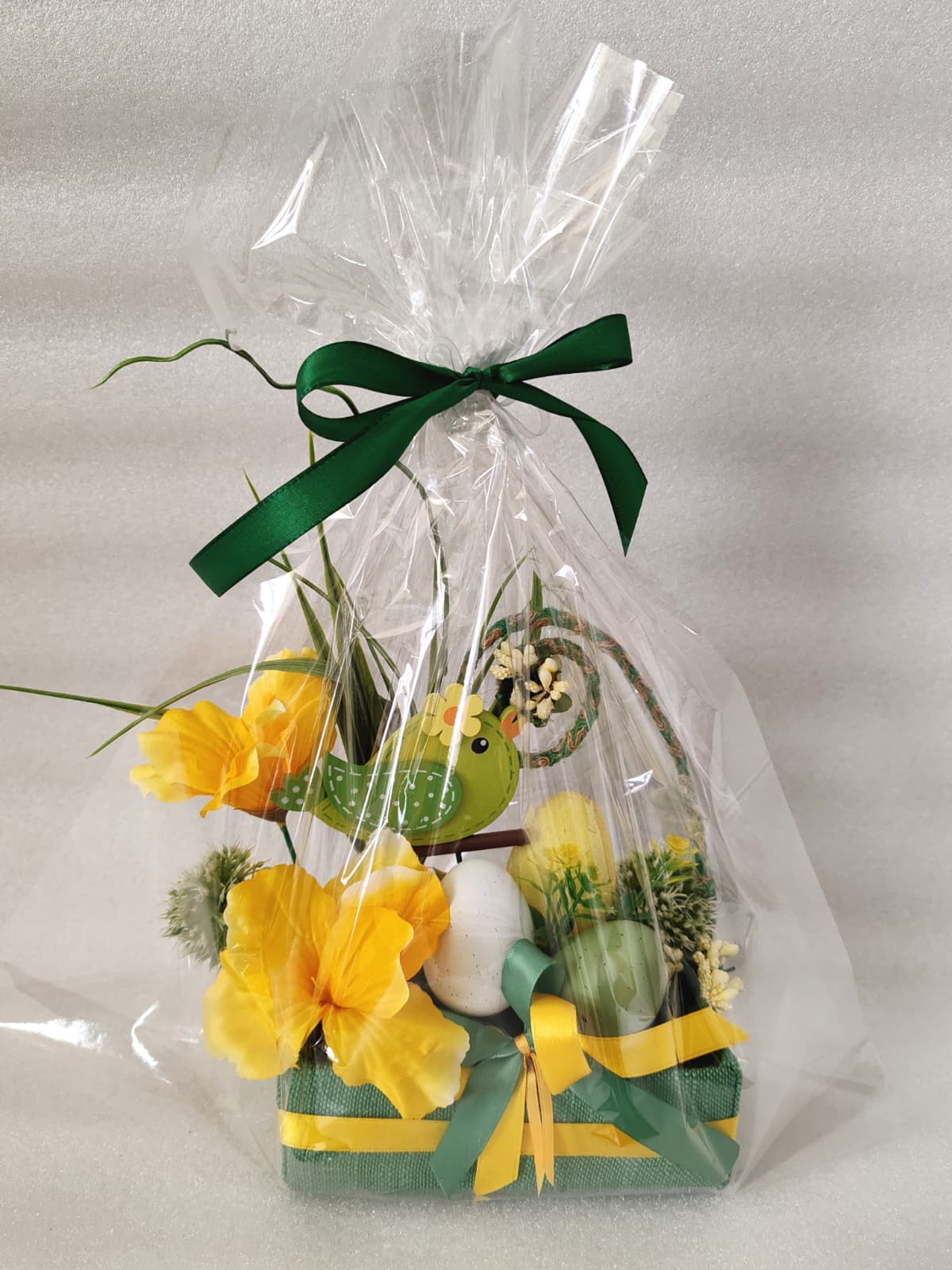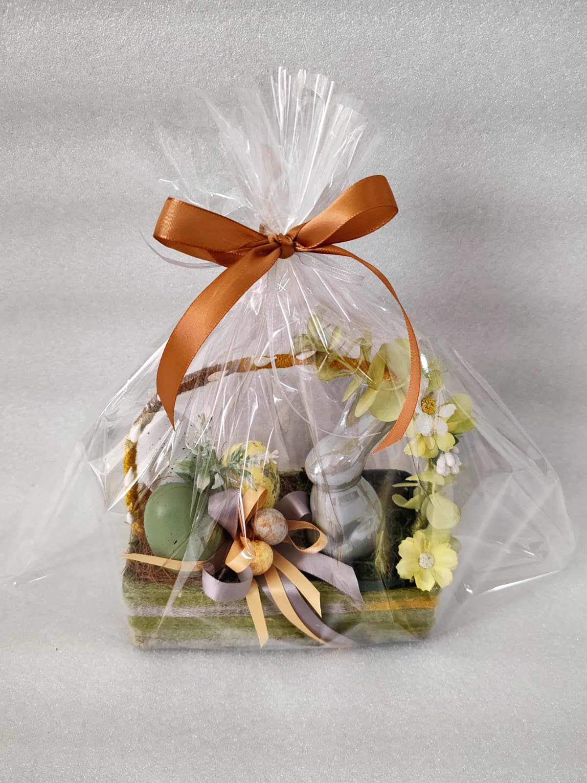 Materiale: Flori material textil și plastic, accesorii din lemn, polistiren, coșuleț din pânză/sfoară și panglici satinate.